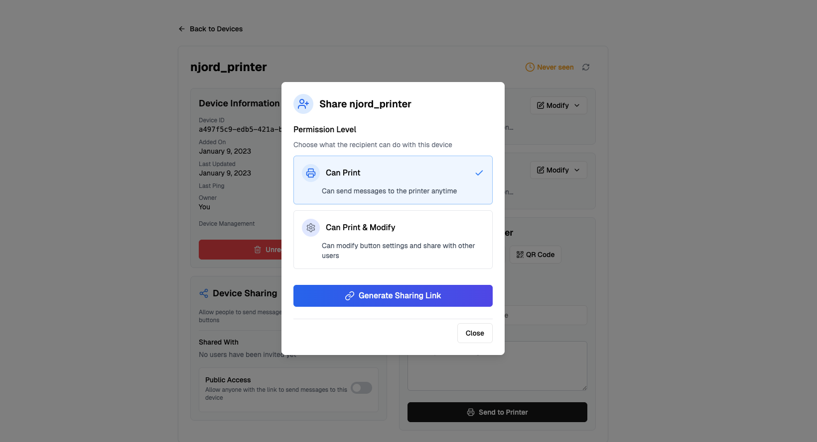 You can now share your printers with others! Send your friends a sharing link, allowing them to send you little messages (or pictures) to your device anytime.